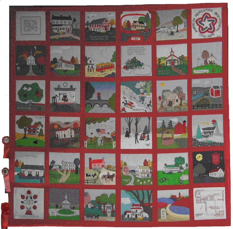 The fraktur design was copied from an original painting done by Job S. Kriebel. He was born July 27, 1838, and died March 17, 1920. Mr. Kriebel was a farmer whose hobby was painting horses, flowers, and frakturs for his friends and family. A number of these excellent examples of the Pennsylvania German art are owned by his family. Lettie Schultz interpreted Mr. Kriebel’s painting and used the two calico prints that appear in each square throughout the quilt. - Central Schwenkfelder Church — Smokie Hoagland