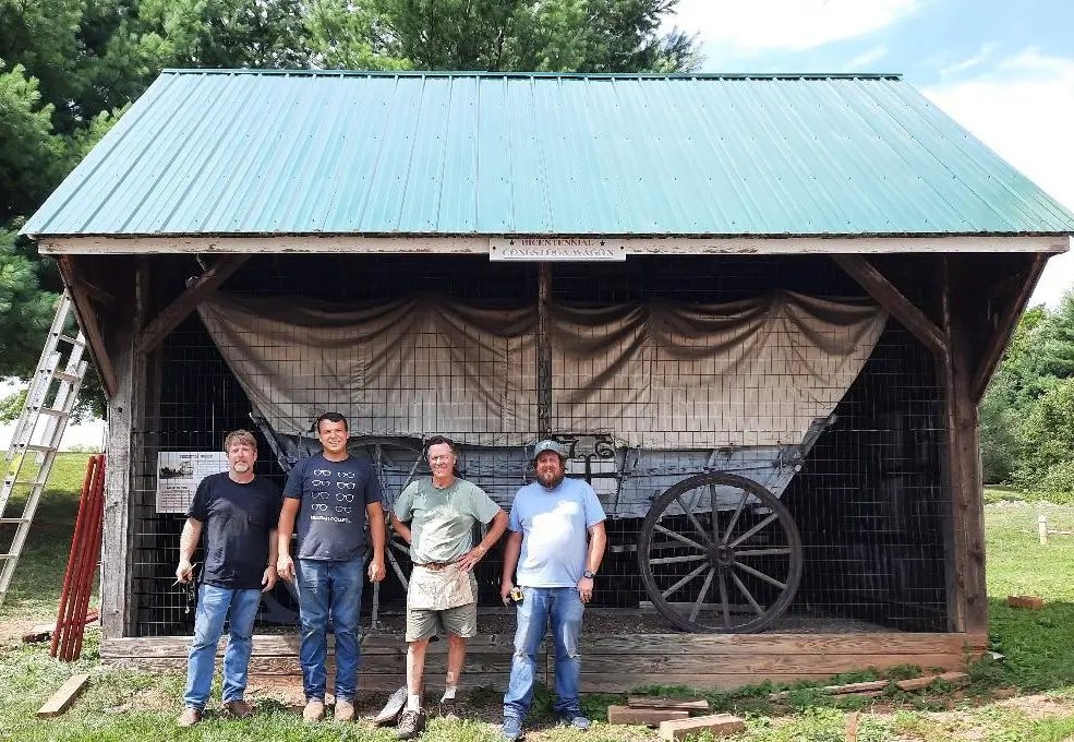 Thirty-five years later the shake roof was beginning to leak and would eventually cause damage to the canvas top on the covered wagon. On July 18, a new steel roof was attached to replace the old shake roof. This was made possible by Wehrung’s, a building supply company located on Ridge Pike, as well as Worcester carpenters who volunteered to put on the new roof. We want to thank Sara Ross, Division Manager of Wehrung’s, a corporate sponsor of WHS, for organizing the donation and delivery of all the building materials required for the job. You will see her in the attached picture with Jim Thompson, President of WHS. The Worcester carpenters are pictured in front of the finished roof: left to right is Kevin Gregory, owner of Ice Concepts and husband of WHS board member, Lisa Gregory, Colin Wurtz and Brad Smith of Brad Smith Woodworking, and Mike Kavanaugh of Bechtel Kitchens who is a WHS board member and is the grandson of the original builder, Dick Shaefer.