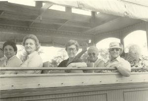 Ann Heebner, unidentified, unidentified, Cleta (waving) and Harold Kerper, unidentified – touring Meadowood Donated by Harold Kerper