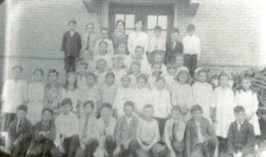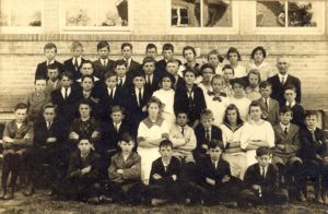Row 2: 1 Principal/Teacher John Fox, 2 Reba Heebner, 3 Leroy Schultz, 4 Robert Schaffer, 5 Francena Anderson, 6 Harvey Bean, 7 Mildred Place, 8 Raymond Stong